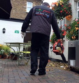 Blowing, sweeping, raking all surfaces.